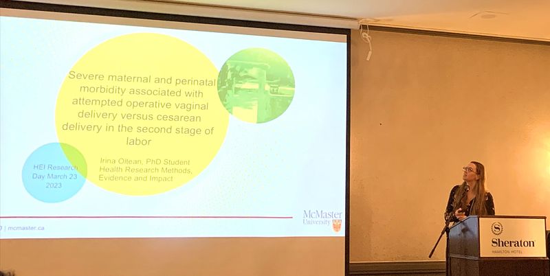 PERL PhD student, Irina Oltean, and MSc student, Meejin Park, presented their work at the Annual Health Research Methods, Evidence and Impact Research Day on Thursday, Mar 23rd. Irina delivered an oral presentation of her work on severe maternal and perinatal morbidity and mortality associated with operative delivery and Meejin presented her poster on Asian-white disparities in obstetric anal sphincter injuries. We are so proud of these exceptional PERLers!!!